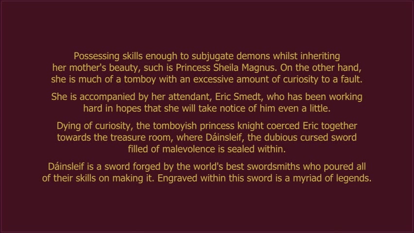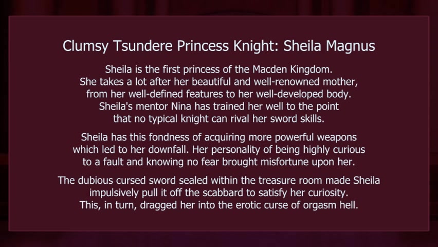 Wh-wh-exactly what are we gonna do?!' cries the 1st princess of the kingdom of Macden, Shiira Magnus, wielding a firesome sword. Appearing in front of the two troubled childhood friends is the person that well known because person with unmatched beauty, elf Nina. She taught the two everything they know. Inside the castle, Nina couldn't help herself and touched the cursed magic sword that has been hidden in the treasure room, in the basement. And with that, the trio's erotic adventures to save Shiira began... 'What have you been doing, you monster! Who do you think I'm!' shouts Shiira as jane is held down. In addition to her is an orc that strips her of her armor and licks her around Percentu Facing her is Nina, holding a whip with a wicked smile on her face. Unable to do just about anything to Nina who whips her everywhere she will, Shiira takes it as being she begins to feel a tingle through the pain...