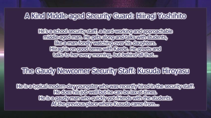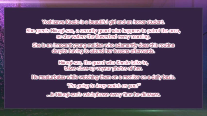 Yoshizawa Kaede is the perfect student who waters the plants and greets the security guard everyday before going to class. The security guard, Hiragi, masturbates to pictures taken of her secretly everyday. She has a boyfriend who plays sports and a best friend named Nishino Youkou. One day she saw Youkou having rough sex with the new security staff, Kusuda. She stands then in shock when Kusuda pushes up behind her and grabs her...