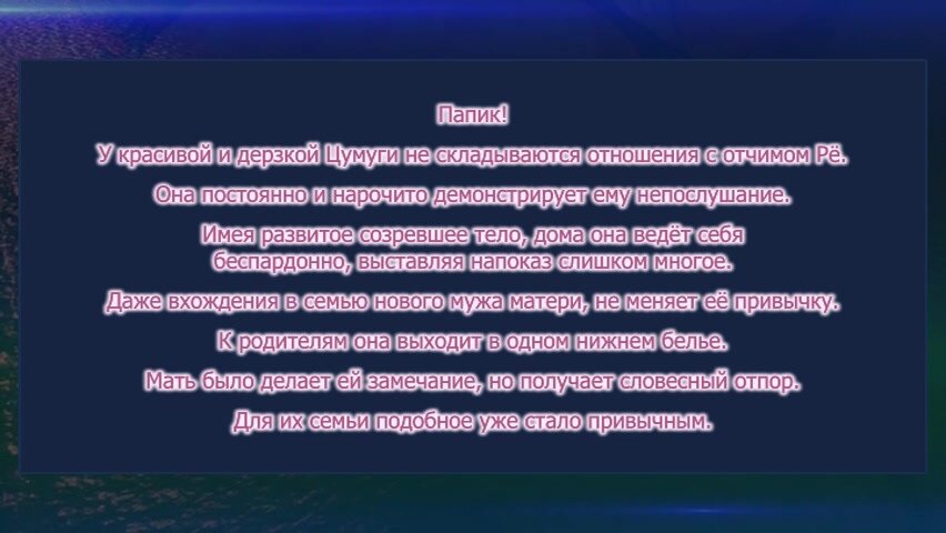 Рё приходится часто сталкиваться с Цумуги дома, ведь по профессии он айти специалист, потому можно сказать, что дом это фактически и есть его рабочее место. Но так же, иногда он ходит работать в свое любимое кафе, где завязывает отношения с Саки, лучшей подругой Цумуги, которые быстро перерастают в сексуальные похождения. И вот в один прекрасный день Цумуги случайно находит телефон Рё оставленным без присмотра, и заглянув в него из любопытства, она натыкается на видео где Хирано изменяет её матери с её подругой. Заметив это Ре решает, что ничего не поделать, раз не получилось стать хорошим отцом, то пусть так, отныне он не станет воспринимать ее как свою дочь, и накажет так как умеет, за всю ее наглость.